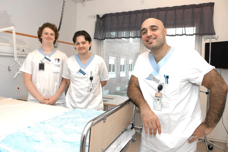 Björn Johansson och Olle Bergwall, sjuksköterskor, och Diego Franco, undersköterska, jobbar på avdelning 51, där patienter vårdas i samband med besvär från urinvägar, övre delen av buken (övre gastrointestinal kirurgi), öron/näsa/hals, mun/käke och ögon. Även nydiagnostiserade cancerpatienter vårdas där.