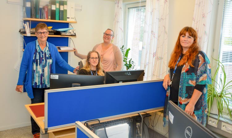 På hälsocentralen i Övertorneå finns ett team med fem medicinska sekreterare. Från vänster Gunvor Taavo, Pia Bjarnestig, Anne Rauma och Elin Eriksson. Saknas på bilden gör Ruth Lindberg, som liksom Gunvor fortsatt att jobba efter pensioneringen.