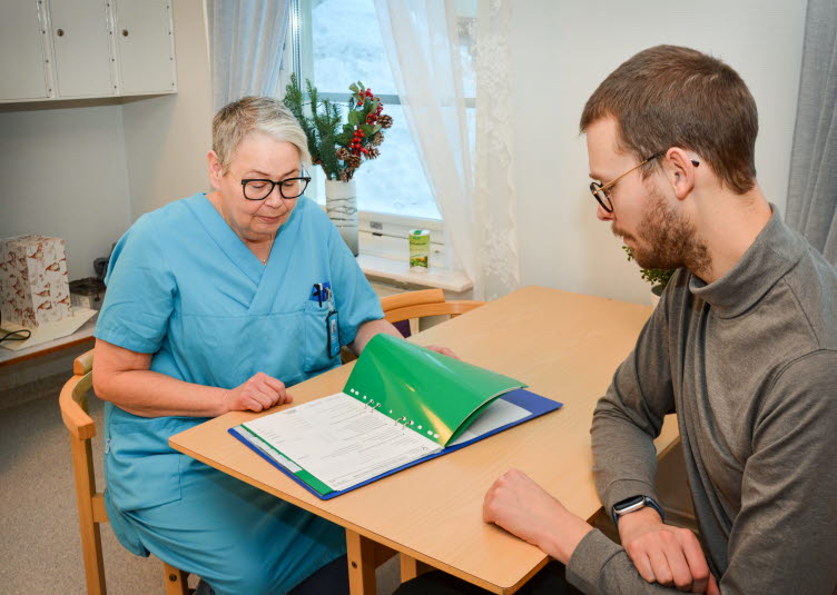 Ronden är avklarad och Joakim Bunne och sjuksköterskan Karin Edenroth fortsätter avstämningen inne på sköterskeexpeditionen. En förmiddag i veckan åker Joakim från sin ordinarie arbetsplats på Hortlax hälsocentral till Mogården på Furunäset, ett av Piteås särskilda boenden för äldre (SÄBO).
