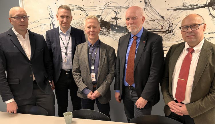 På bilden från vänster: Linus Niva, samhällsomvandlingschef (LKAB), Stefan Hämäläinen, direktör för samhällsomvandling (LKAB), Mats Taaveniku (S), kommunalråd Kiruna kommun, Anders Öberg (S), ordförande för regionstyrelsen i Region Norrbotten och Unto Järvirova, projektchef regionens nya sjukhus i Kiruna. Foto: John Sandström Inga restriktioner