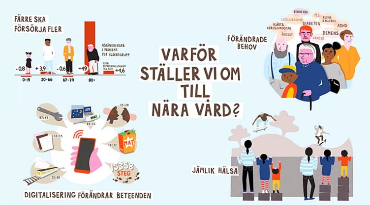 Nära vård innebär stora möjligheter, men också krav på omställningsförmåga, tillit och gränsöverskridande samarbete för att samhällets resurser ska kunna användas på bästa möjliga sätt. Det handlar om att utgå från personens behov och förmågor samt att på olika sätt främja hälsa. Vård och omsorg behöver komma närmare medborgarna och göra dem mer delaktiga.
