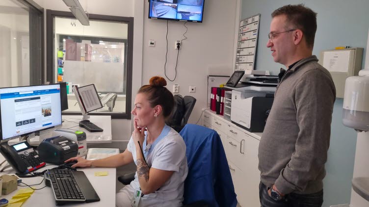 Nadja Ståhl, sjuksköterska, och Mattias Josefsson tittar på hur vårdplatsläget ser ut för de patienter på akutmottagningen som behöver slutenvård.