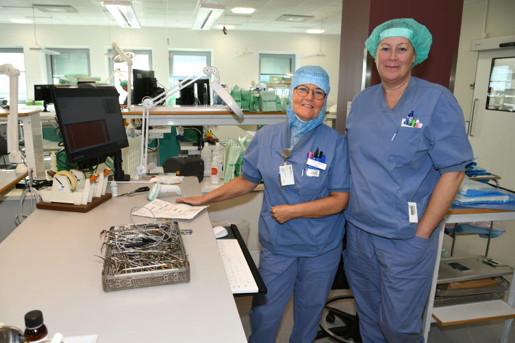 ”Längre tillbaka skötte operationssjuksköterskorna själva sina instrument förutom en mindre sterilcentral för externa kunder, men när Sunderby sjukhus byggdes startades Sterilcentralen här och i samband med att nya akutflygeln byggdes för några år sedan fick vi helt nya lokaler,” säger Annica Lundström och Maria Hedkvist.