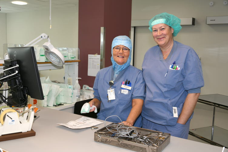 Annica Lundström, sektionsledare och operationssjuksköterska, samt Maria Hedqvist, undersköterska, visar hur de skannar vartenda instrument före och efter operation och packar dem i gallerkorgar.