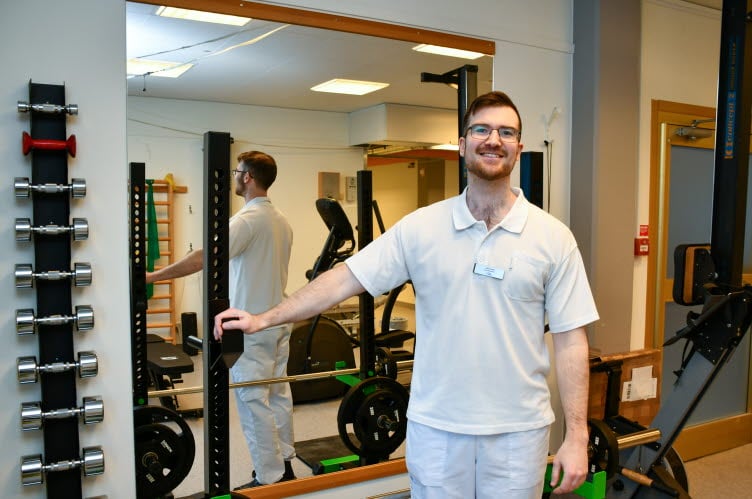 – Jag har länge hållit på med olika idrotter, bland annat klättring och styrketräning, och intresserat mig för kroppen, anatomin och maten. En axelskada fick mig att läsa på om sportskador och rehabilitering. För mig var utbildningen till fysioterapeut klockren och jag trivs otroligt bra idag, säger han.
