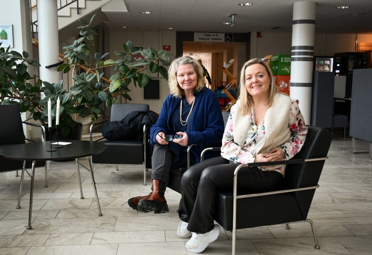 Hållbarhetsenhetens arbete bidrar till Agenda 2030, FN:s globala handlingsplan med 17 mål för en hållbar omställning. Monica Kutics Normark och Joanna Hansson, till höger, visar upp ett av målen.