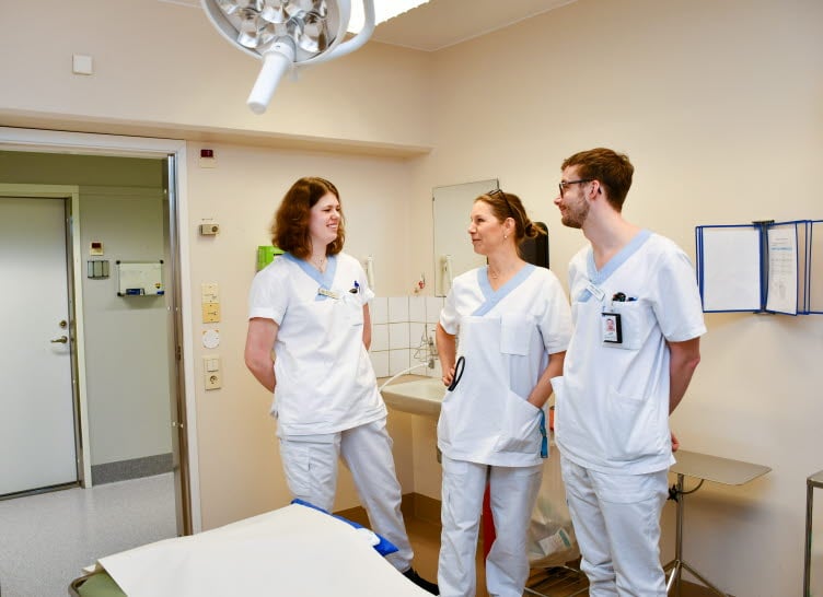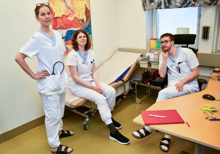 ”Handledningen har varit jättebra. Det har alltid känts tryggt när man släppt iväg patienten”, säger Arina Chichina och får medhåll av kurskamraten Albin Mikko. Till vänster Anna Bengtsson.